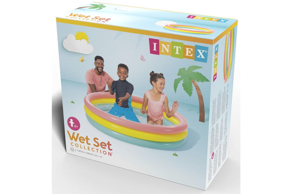 Bring colourful summer fun to your backyard with the Intex Sunset Glow Pool! Featuring three vibrant pastel-colored inflatable rings and a soft cushioned floor, this pool is designed to keep children cool, comfortable, and smiling all season long. Its spacious size makes it great for siblings or friends to splash and play together, while its durable vinyl construction ensures lasting enjoyment.