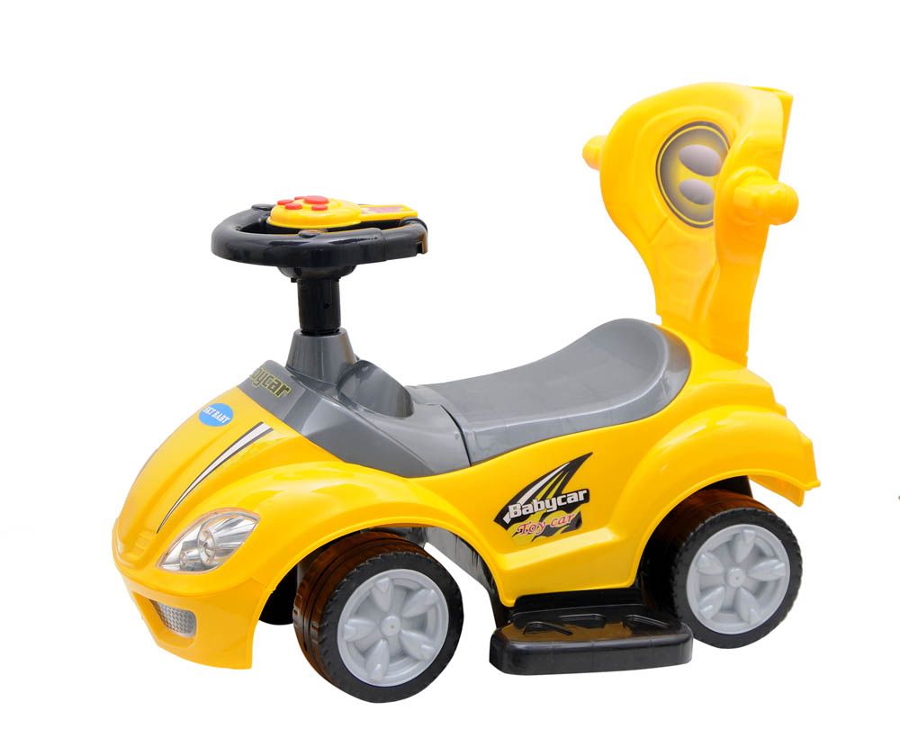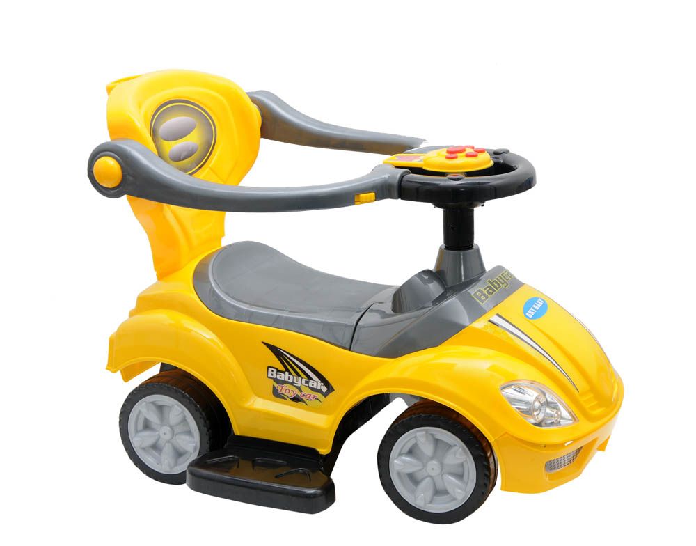 Design: Sliding baby carriage style ride-on with smooth edges