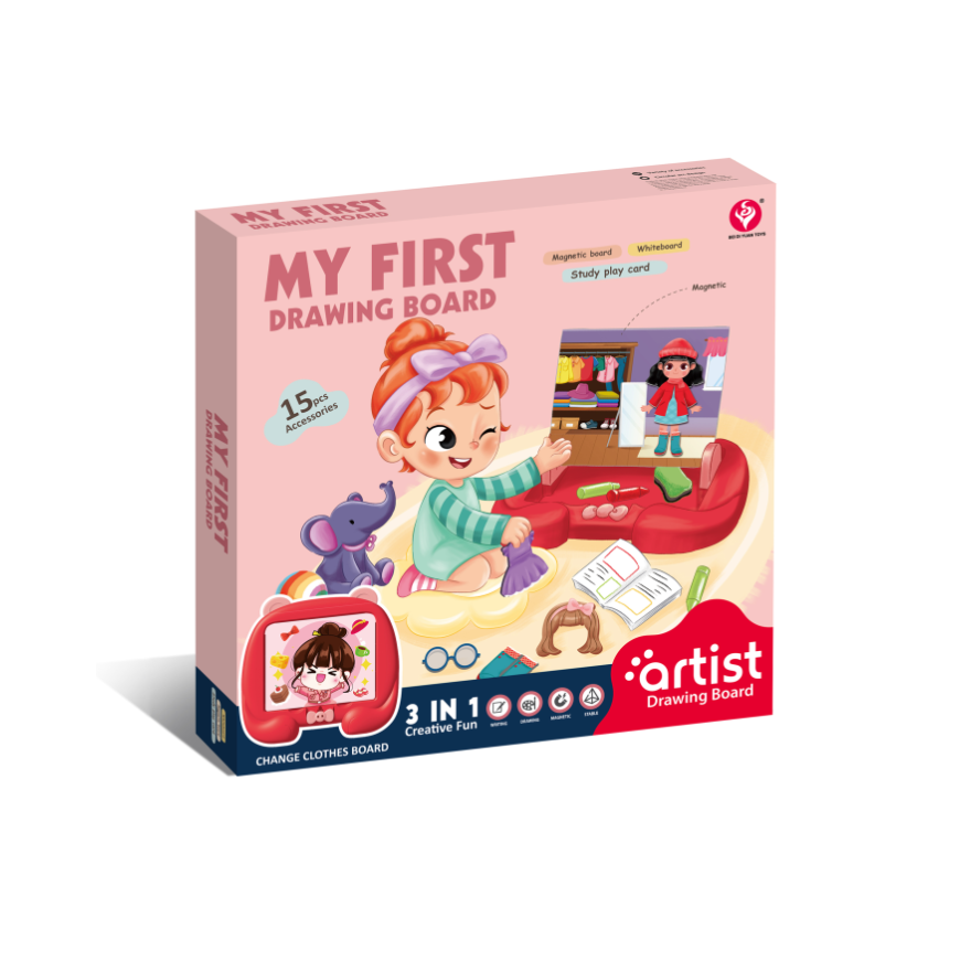 Unleash creativity and encourage early learning with the My First Drawing Board “Artist” 3-in-1 Creative Fun Set. This versatile activity set features a magnetic board for dress-up play and study cards, a smooth whiteboard for drawing and writing, and a playful change clothes board with 15 fun accessories. Kids can enjoy hours of imaginative play by mixing and matching magnetic outfits, practicing drawing skills, and exploring basic educational concepts.